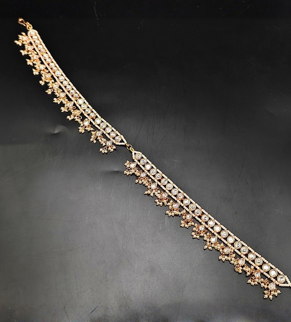 This exquisite Sheesh Patti is a timeless piece of bridal head jewellery, designed to enhance the beauty of the bride’s forehead and hairline. Crafted with shimmering kundan stones arranged in a graceful curved pattern, it reflects a perfect blend of traditional elegance and royal charm. Perfect for weddings, nikah, receptions, mehndi, and festive occasions.