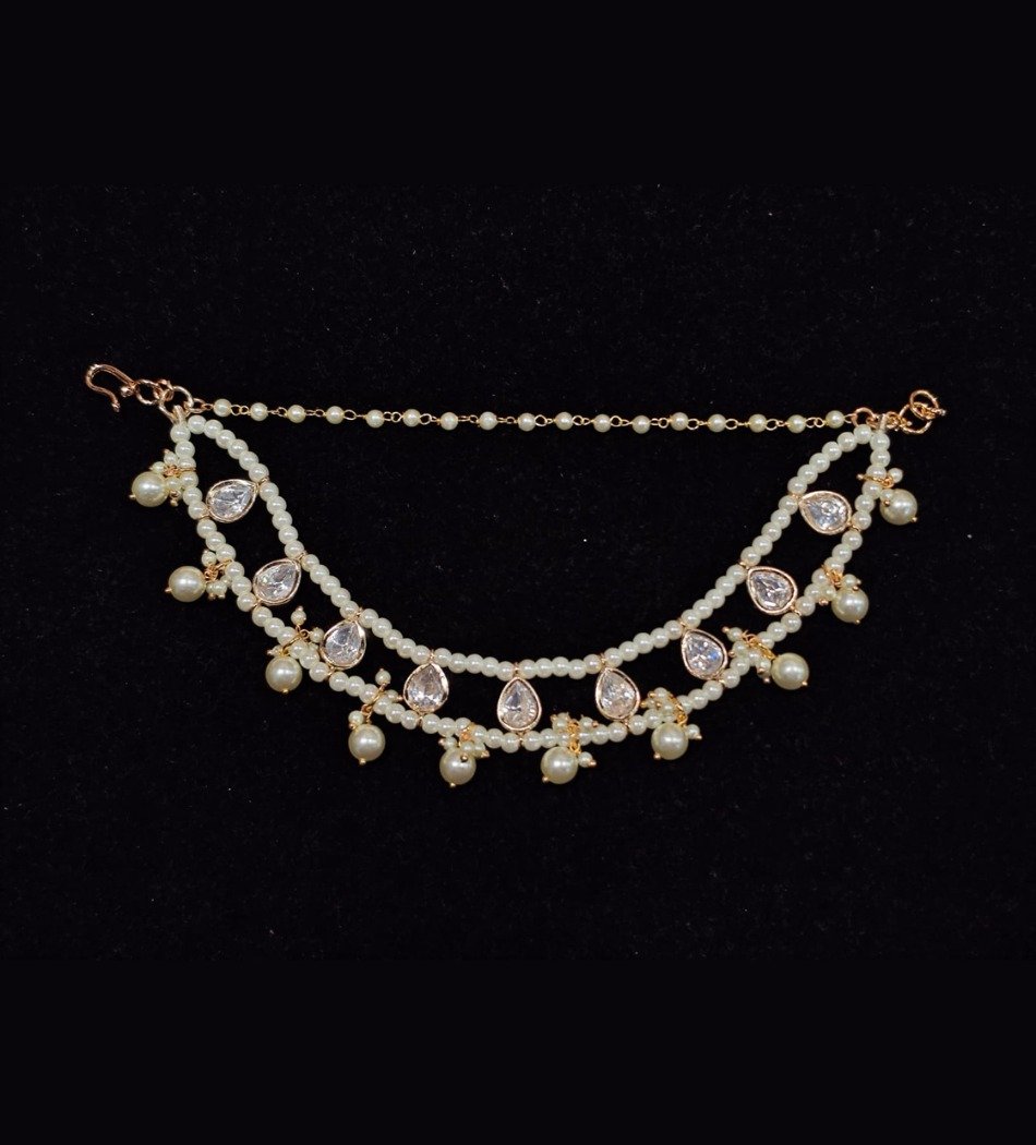 An exquisite double‑strand pearl earchain adorned with teardrop transparent gemstones (Kundan/ zircon) in gold settings and dangling pearl beads, designed for elegant ear embellishment and traditional styling.
