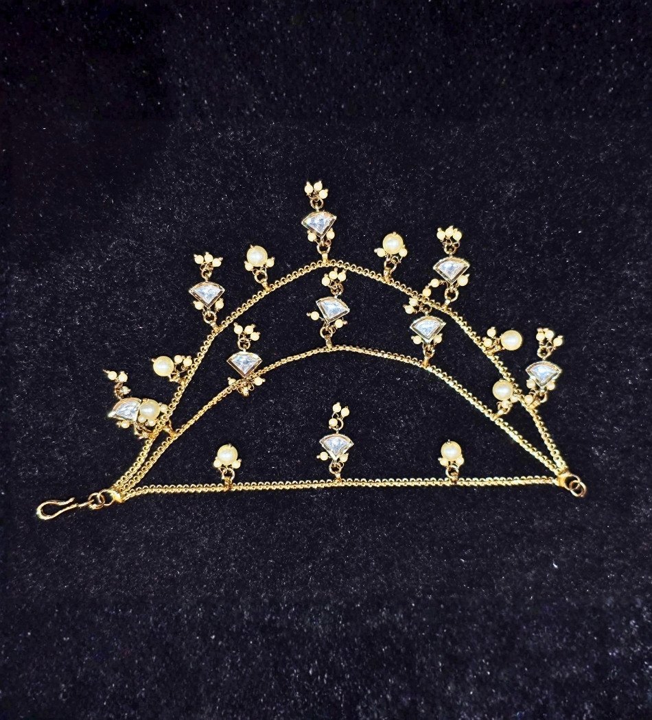 This exquisite bridal ear chain is designed to add a touch of elegance and charm to your traditional look. Crafted in a sleek silver-tone finish, the chain is beautifully adorned with sparkling crystal stones and delicate pearl drops. Perfect for brides, receptions, and special occasions, this ear chain brings a unique and sophisticated flair to your overall jewellery look.