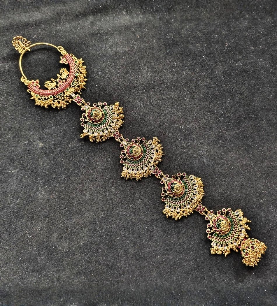 This Kundan Meenakari Bridal Hair Choti is a perfect blend of traditional artistry and royal elegance. Designed with beautiful circular kundan motifs, each piece is delicately detailed with handcrafted meenakari work that adds a soft touch of color and heritage charm. Ideal for brides wearing lehenga, saree, or traditional attire, this hair choti adds a regal and timeless beauty.