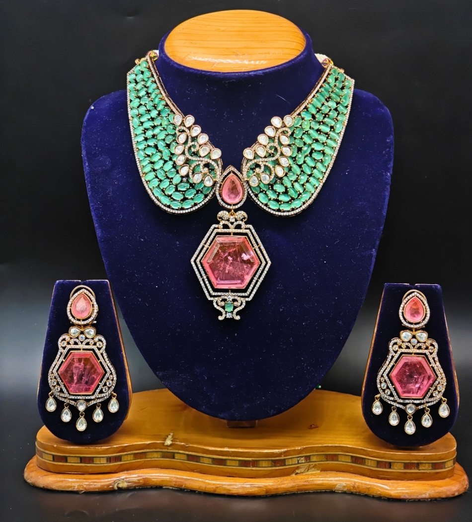 This exquisite Mint Green & Rose Stone Designer Collar Set is a perfect blend of contemporary elegance and artistic craftsmanship. The beautifully handcrafted collar necklace features delicate mint green bead strands paired with sparkling diamond-cut crystal accents. Ideal for weddings, engagement functions, festive celebrations, receptions, and special occasions.