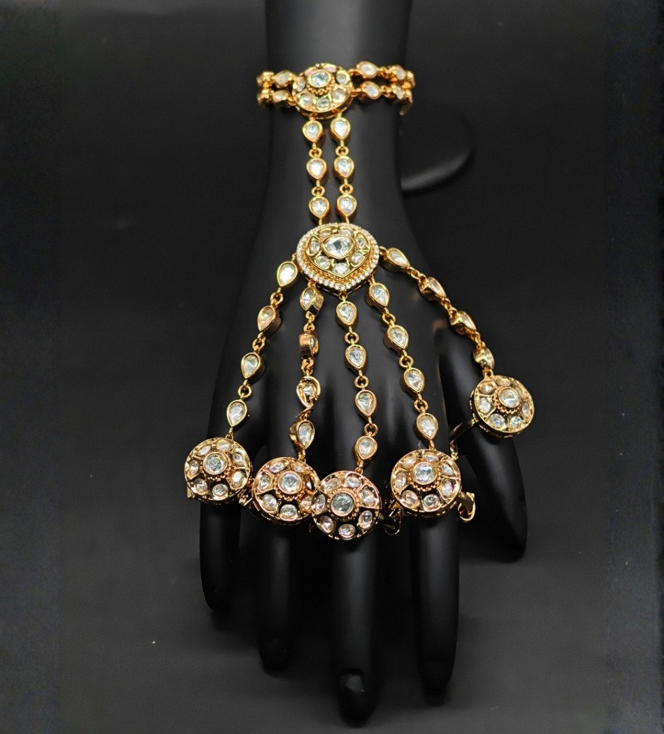 This Royal Polki Cluster Bridal Hathpan is a magnificent hand ornament crafted to give the bride a truly regal look. Designed in a luxurious gold-tone finish, it features sparkling polki-style stones arranged in beautiful round cluster motifs that create a bold and royal appearance. Ideal for weddings, receptions, and special occasions.