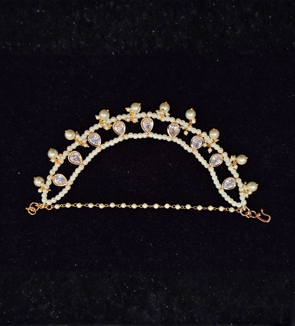 This beautiful bridal ear chain is designed to add graceful charm and royal elegance to your wedding look. Crafted in a delicate gold-tone finish, the ear chain features shimmering polki-look crystal stones set in elegant teardrop shapes, paired with soft white pearls. Ideal for brides, receptions, and festive occasions, this ear chain enhances both classic and modern bridal styles.