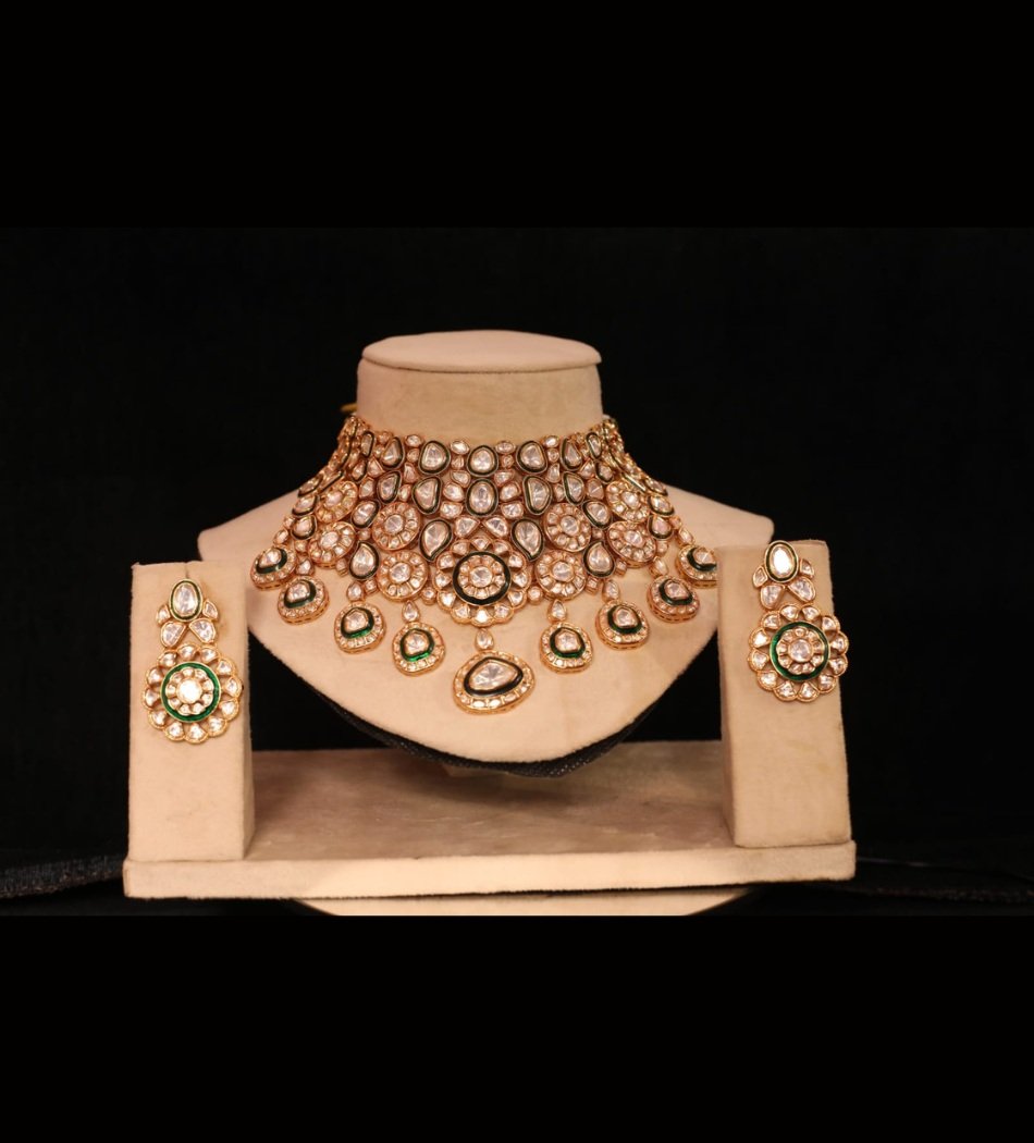 An exquisite bridal choker necklace crafted in luxurious gold, studded with shimmering Polki Kundan stones arranged in intricate floral motifs. The design features elegant emerald enamel detailing and sparkling small polki accents around each medallion, complemented by matching earrings with pendant drops. Perfect for weddings and grand festive occasions, this set adds timeless regal charm and opulent radiance to any bridal ensemble.