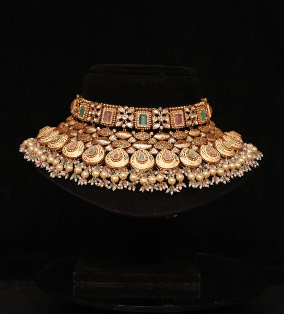This exquisite two-layer choker necklace showcases traditional Meenakari craftsmanship with gold-plated settings, intricate floral motifs, and alternating Mint & Pink stone insets surrounded by sparkling kundan stones. The lower tier features elegant circular medallions with enamel work and delicate pearl fringes that add a luxurious, regal touch perfect for bridal or festive wear. The design blends classic Indian artistry with modern elegance, making it a stunning statement piece for weddings or special occasions.