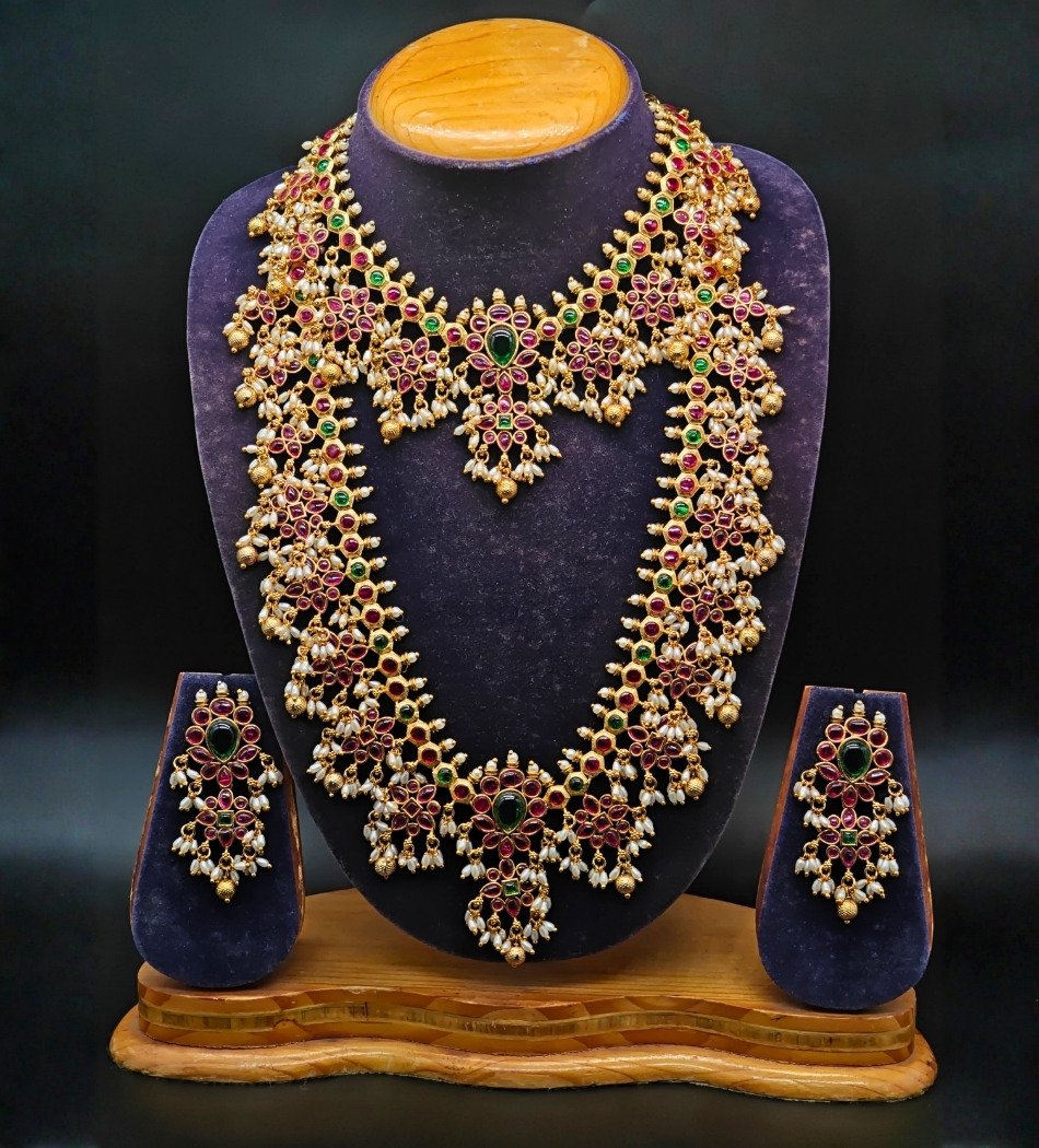 This exquisite South Indian Bridal Jewellery Set is crafted in a luxurious antique gold finish and beautifully adorned with traditional kemp stones and emerald-tone kundan work. The set features an elegant long haram and a matching short necklace, designed with intricate South Indian motifs. Ideal for South Indian weddings, muhurtham, temple functions and bridal looks.
