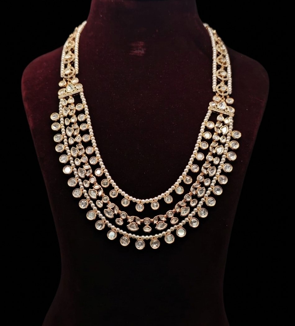 Embody the timeless elegance of royalty on your wedding day. This exquisite three-tiered Sherwani mala features intricate gold-toned craftsmanship set with shimmering Kundan-style stones and delicate seed pearls. Designed to drape perfectly over a traditional Sherwani or Achkan, this statement piece adds a majestic finishing touch to the groom’s ensemble.